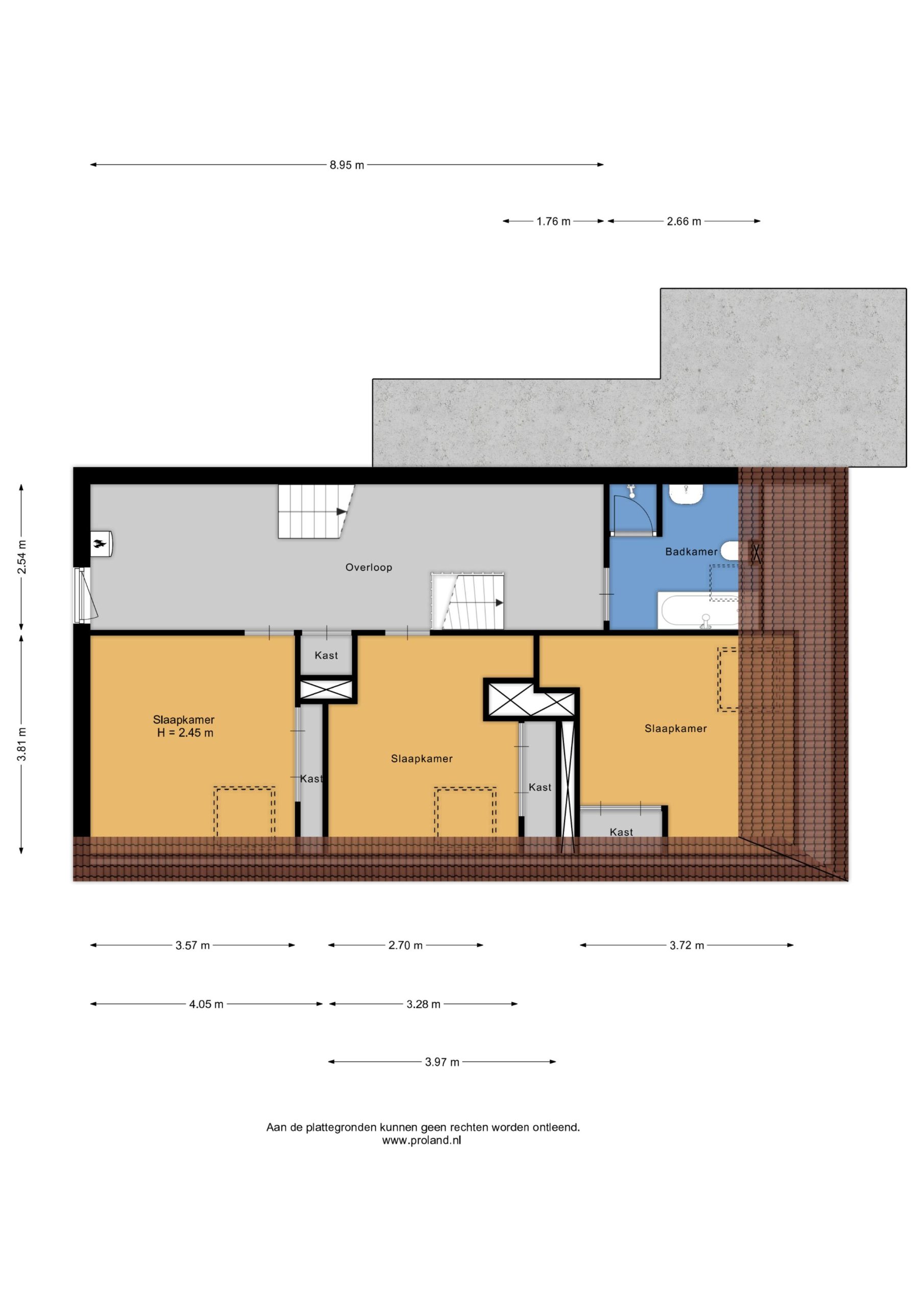 Overloop met 3 slaapkamers (13,5, 14 en 15 m2) en een badkamer (ca 6,75 m2) met douchehoek, ligbad, wastafel en toilet. De slaapkamers hebben allen vaste kasten en zijn voorzien van radiatoren.
