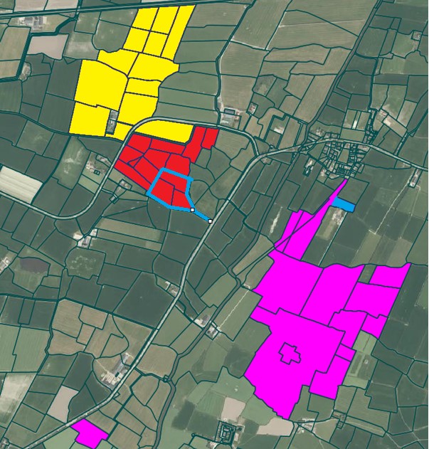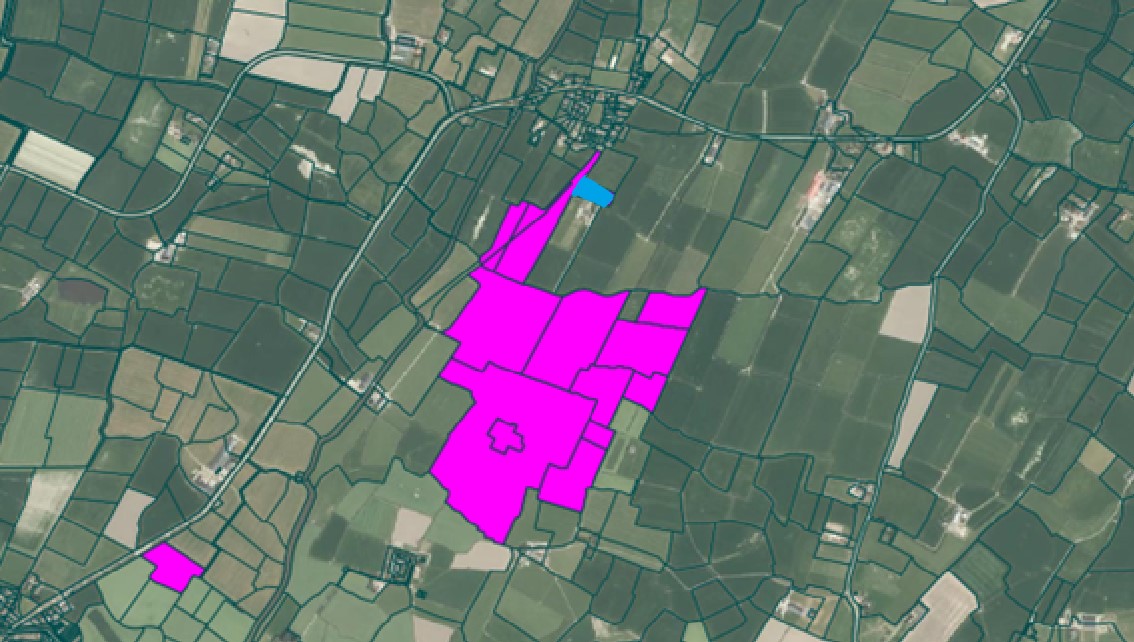 Rondom de boerderij ligt ruim 60 hectare cultuurgrond (excl. erf en ondergrond). Op korte afstand ligt nog een veldkavel van 2.27.30 hectare. De ontsluiting is via het erf, oprit en/of via de openbare weg. De grond bestaat uit goede en vruchtbare kleigrond met een ruim voldoende teelaarde en een goede ontwatering. De overwegend grote kavels zijn erg goed bewerkbaar en voorzien van brede dammen. Door de aanwezigheid van schouwsloten is het goed mogelijk om de percelen eventueel te beregenen. De meeste percelen zijn gedraineerd (8-12 meter). Doordat er op meer dan de helft van de sloten schouw zit worden deze sloten door en op kosten van het waterschap schoongehouden. Op korte afstand aan de andere kant van het dorp bevinden zich nog 2 mooie veldkavels. Deze kunnen in overleg ook (deels) worden gekocht of gepacht, zodat de boerderij is uit te breiden tot ruim 100 hectare.