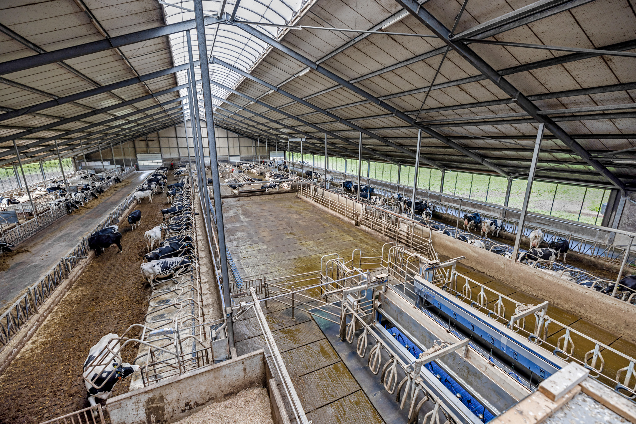 De melkstal bestaat uit een 2 maal 14 Rapit Exit van De Laval met beweegbare vloer automatische afname, koeherkenning, melkmeters en activiteitenmeting van De Laval. Er is een eigen melktank met een capaciteit van 24.000 kg. met voorkoeler en een warmte terugwininstallatie. Daarnaast is er een technische ruimte. Ook is er een apart kantoor op de beneden verdieping voor de koe administratie. Het kantoor is iets verhoogd zodat je een goed overzicht hebt over de koeien. Ook is er een raam in het kantoor zodat je uitzicht hebt over het erf en toegangsweg. Het kantoor is voorzien van vloerverwarming (Agriheat boiler voor o.a. heet water en vloerverwarming voor kantine en kantoor).