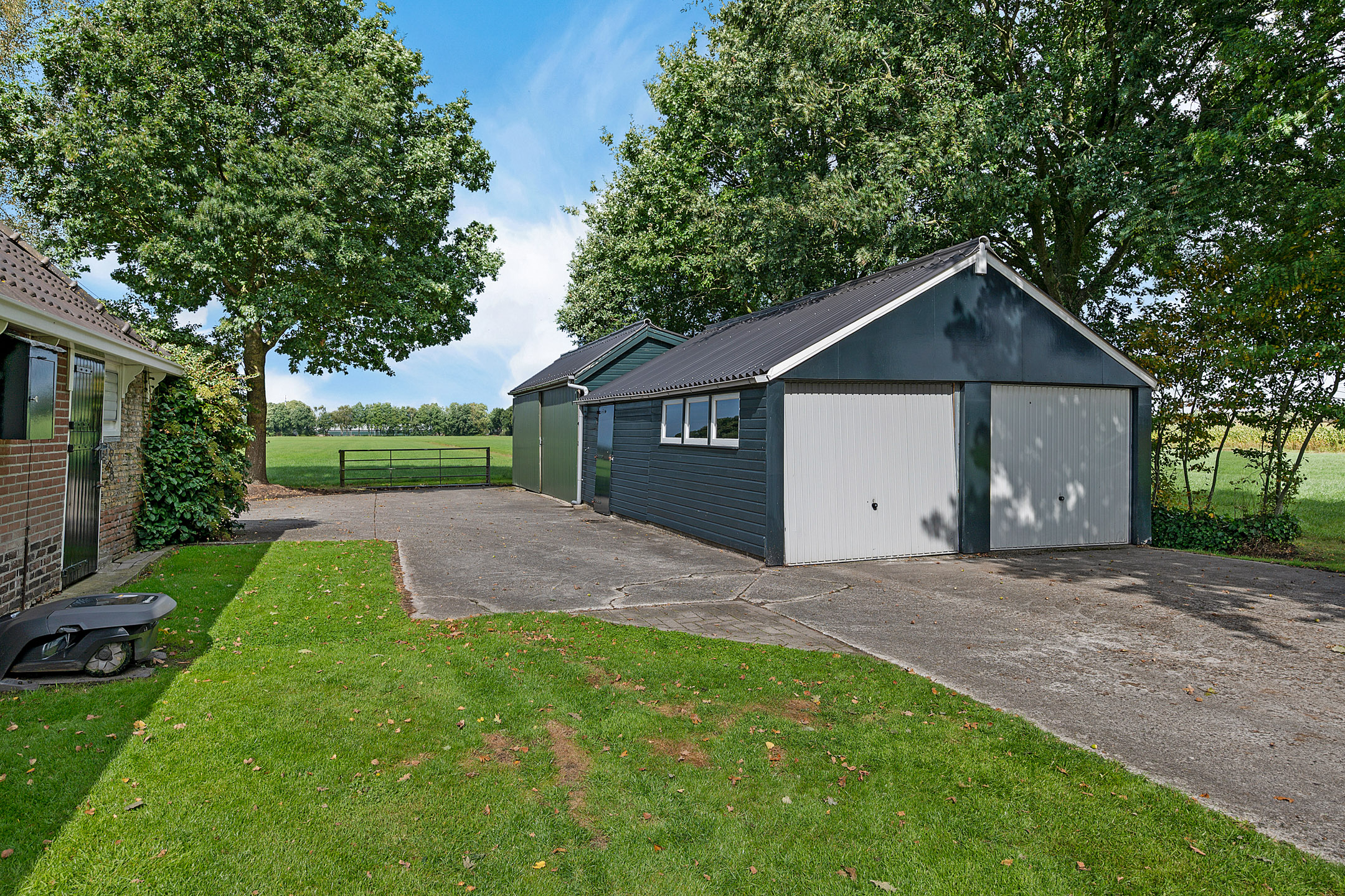 Deze dubbele garage is opgetrokken uit hout en meet circa 5,19 bij 7,91 meter.  Het dak is bedekt met golfplaten en de vloer is van beton.