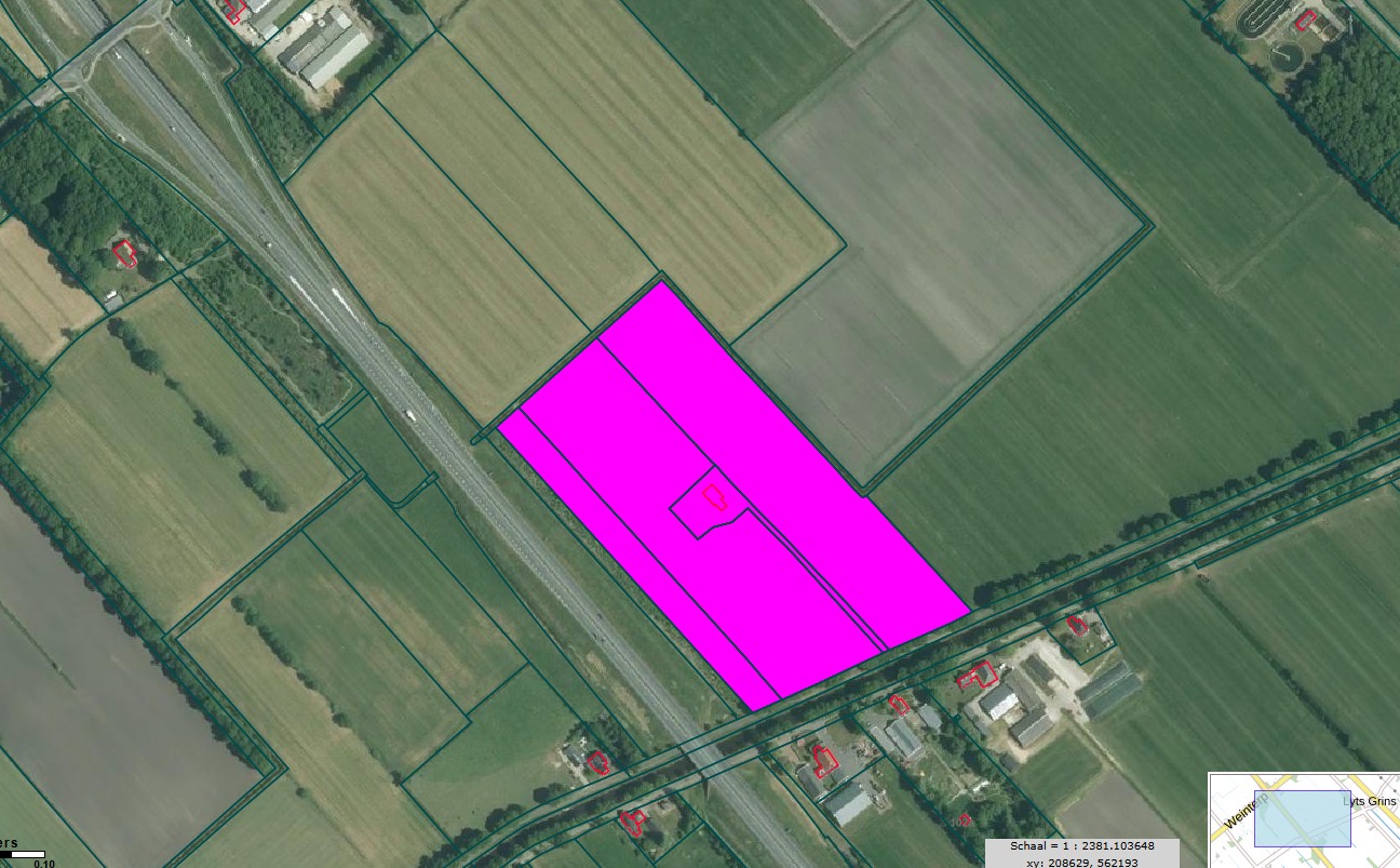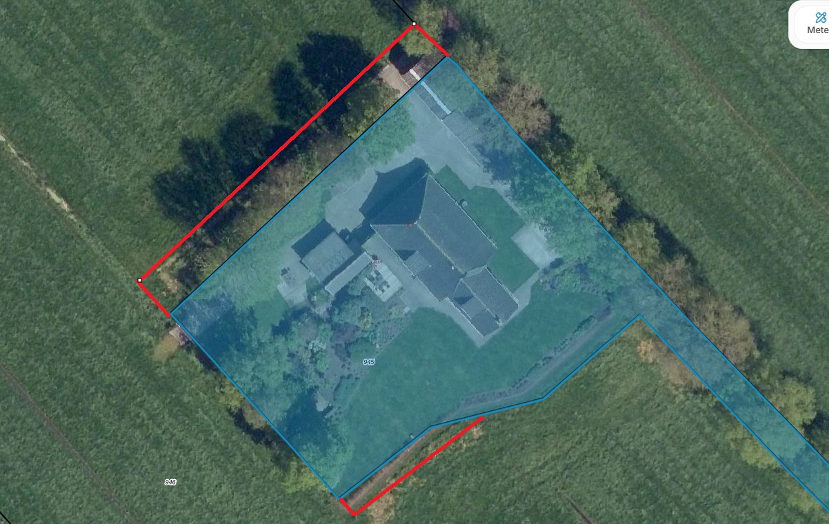 • Indien het aangebodene in gedeelten wordt verkocht dient het kadaster te komen om de feitelijke oppervlakte uit te meten. Gezien de ligging van de kadastrale grenzen wordt de oppervlakte horende bij het erf en woning iets groter. Overmaat dient te worden verrekend tegen € 10,– per m2. In de bijlage is een kaartje te zien waar de grenzen dienen te worden aangepast. Kosten uitmeten kadaster zijn voor koper.